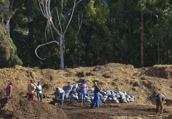 Massive mountains of steaming compost, with a border of the tallest Blue gums in the distance.